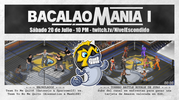 ¡BACALÁNGANA! Este próximo sábado 20 de julio a las 10 PM no se pueden perder el primer BacalaoMania donde, Team Yo Me Quité (Gatonejo & Sparrowolf) se mide ante Team Yo No Me Quito (Alexnation & Mash) por el campeonato Interbacalao en Parejas. Y como evento principal, Torneo Battle Royale de Subs con premio para la persona ganadora.