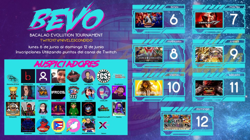 Por segundo año consecutivo regresa el Bacalao Evolution Tournament (BEVO). El evento estará corriendo durante nuestra segunda semana temática de este año. Cada día de esa semana estaremos corriendo un torneo diferente para un máximo de ocho participantes, con premios para las personas ganadoras.